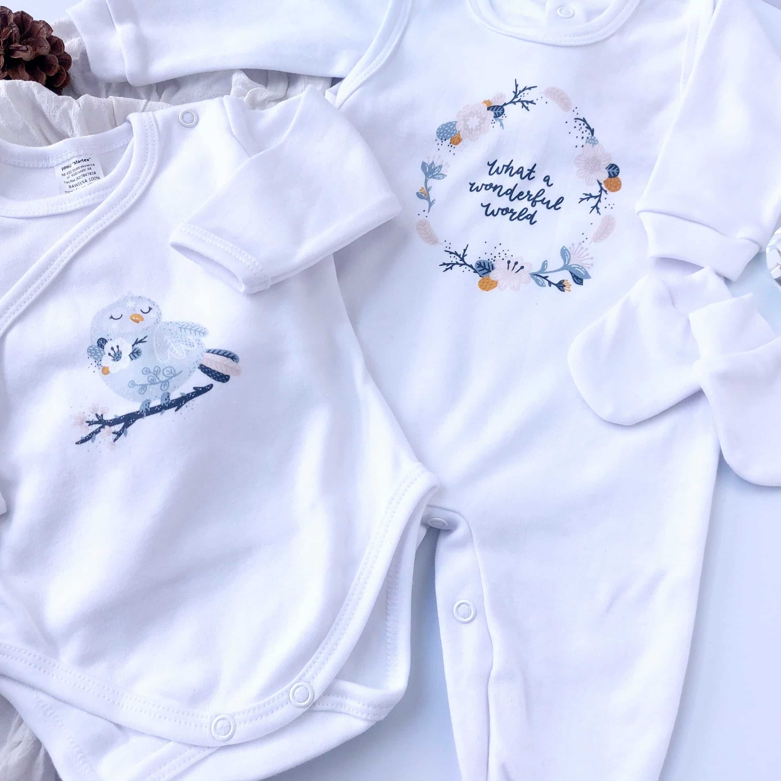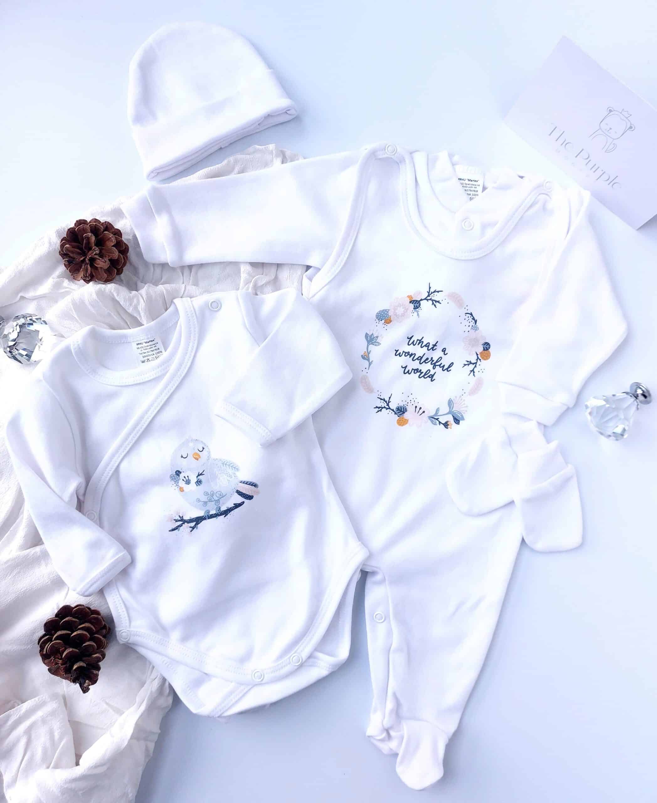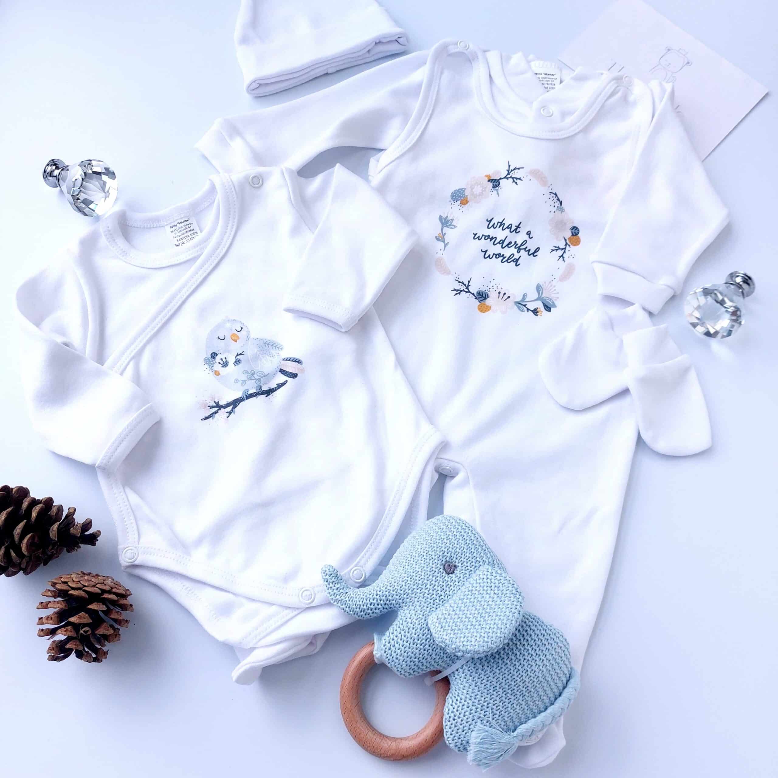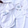 Cute Clothing 5 Pcs Set: for the baby’s first days. The set consists of a side-snap, a long-sleeved kimono-style bodysuit (essential in a newborn wardrobe), a warm top with a snap closure, a sleeveless romper ( easy to put on, fastened with a press-stud inside the legs and on the shoulder), hospital hat and newborn mittens. All made from 100% soft cotton. Size 56cm – suits babies from day one up to 3 months.